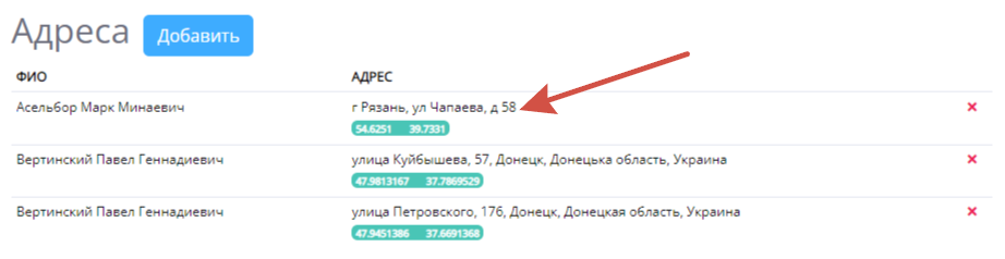 6.Адрес появляется в блоке. Если адрес неактуален- вы можете его удалить, нажав на крестик.