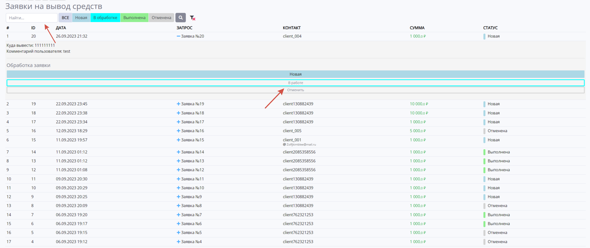 Здесь также можно выставить фильтры на нужные вам заявки. Система оснащена статусным режимом, который также отображается в личном кабинете клиента.