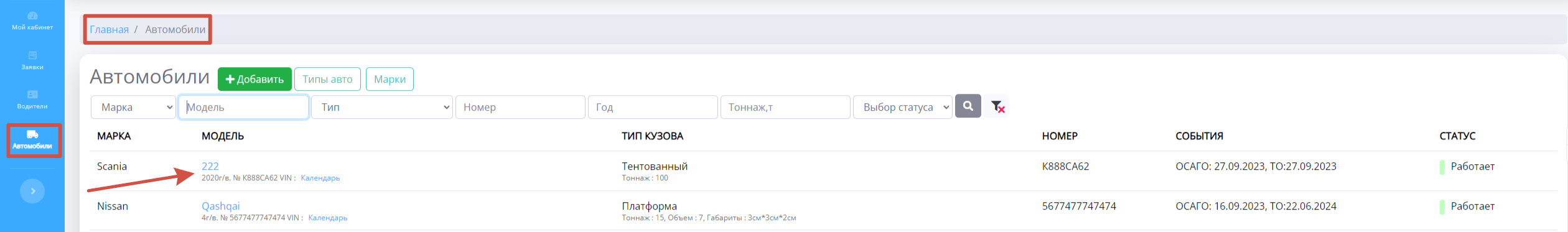 Для того, чтобы это сделать нужно перейти в раздел Автомобили и выбрать нужный для вас объект.