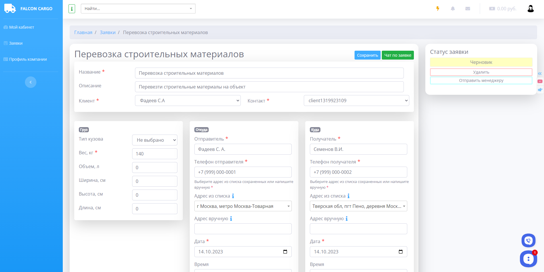 Просмотр заявки доступен на странице "Заявки" и позволяет изменить параметры заявки до отправки менеджеру или просматривать параметры, скорректированные менеджером. Отображает этапы (статусы) прохождение заявки. Позволяет оставлять комментарии на заявке или вступить в чат с менеджером и другими сотрудниками, обрабатывающими эту заявку.