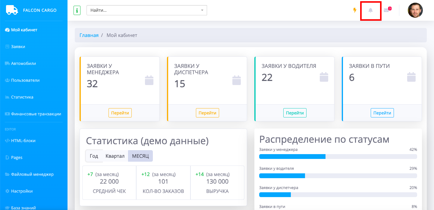 Иконка уведомлений расположена в правом верхнем углу страницы.