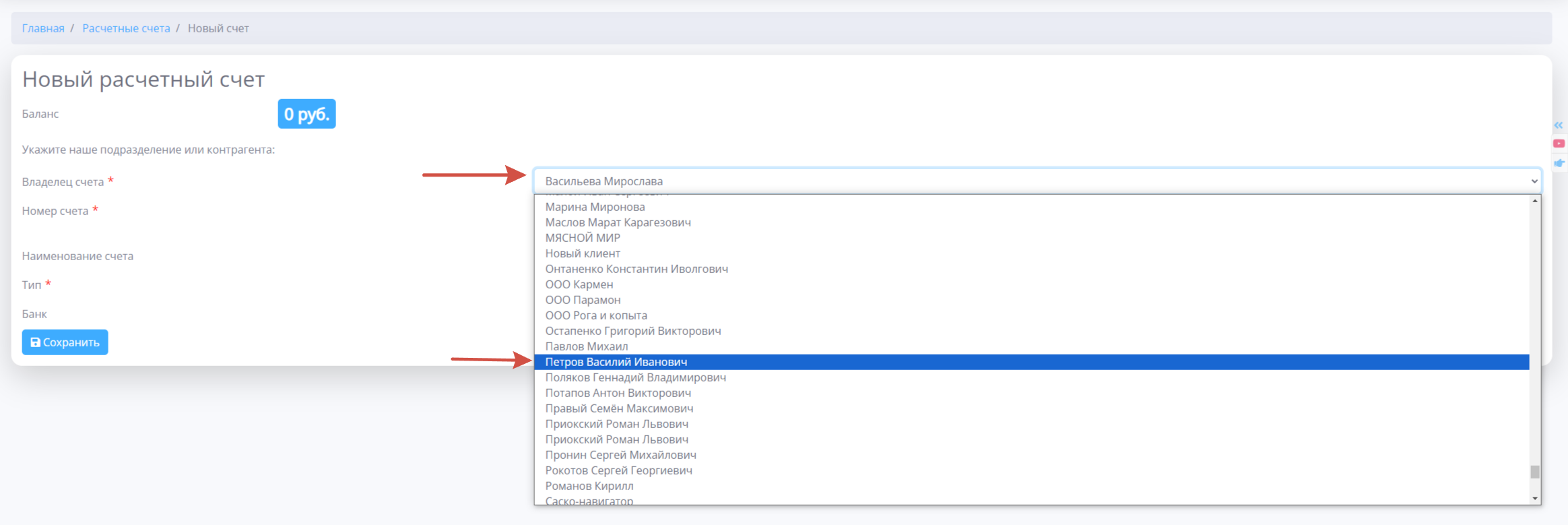 2.Перед вами открывается форма для заполнения данных и выбора владельца счета, которого можно выбрать в предложденном выпадающем списке: