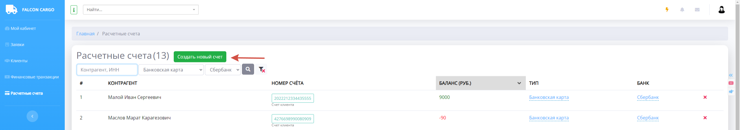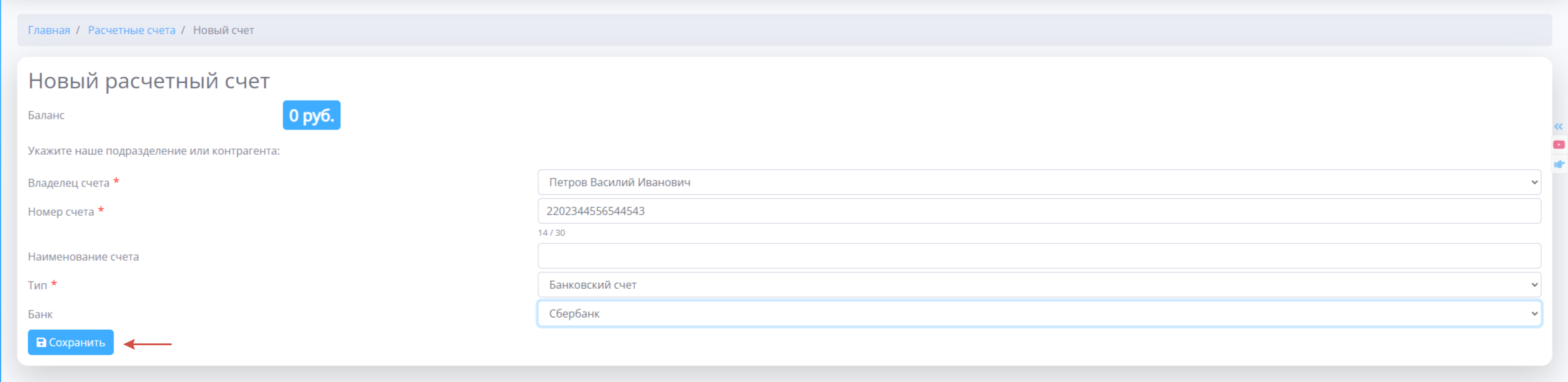 3.Заполняете оставшиеся данные и нажимаете на кнопку "Сохранить" и к клиенту привязан созданный вами счет!