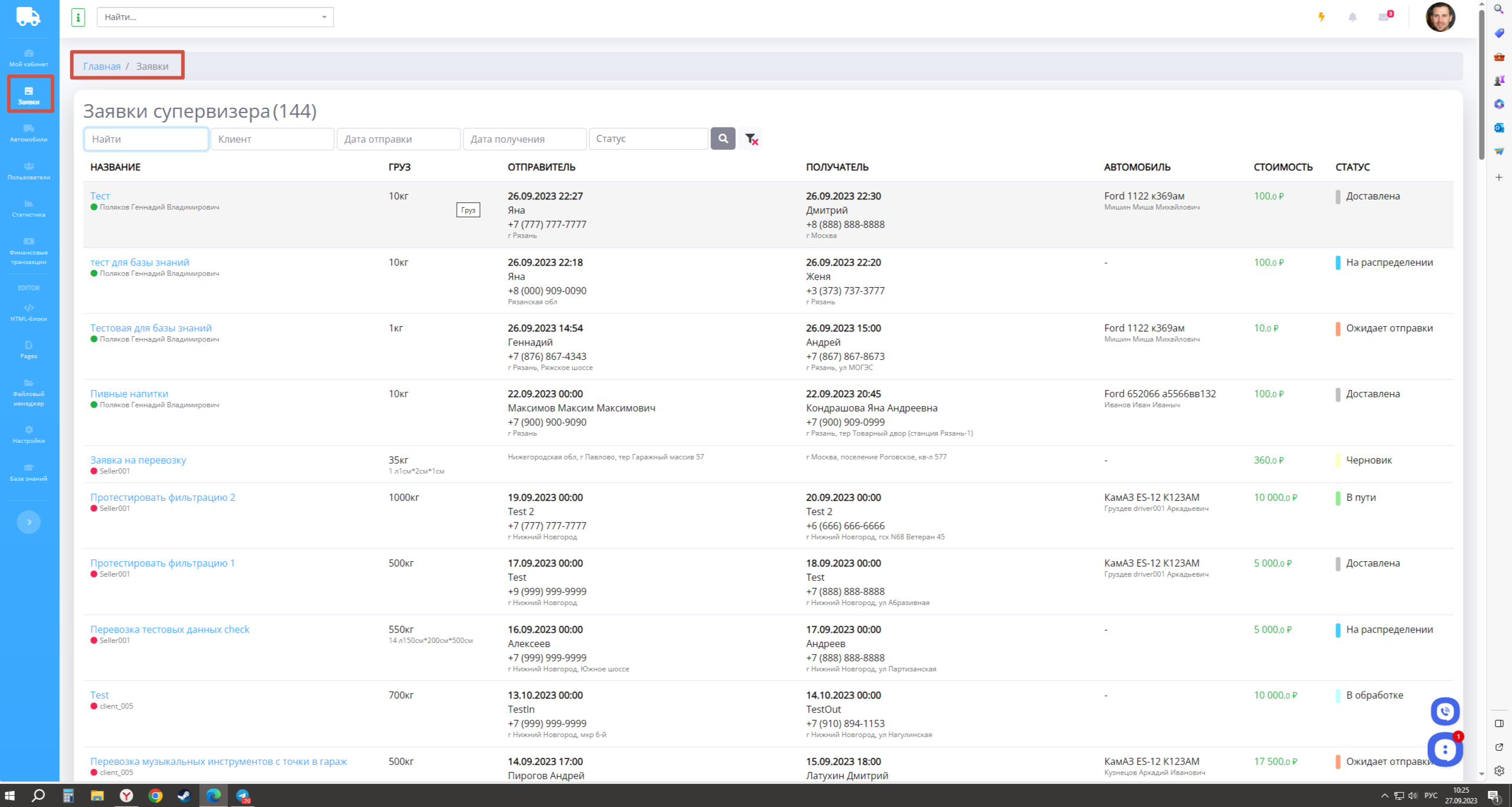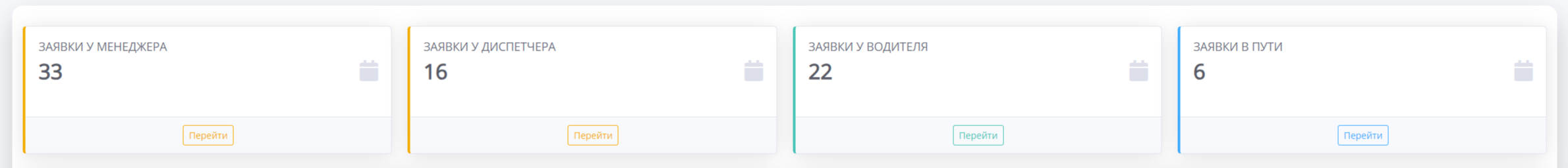 Также менеджер может перейти в сгруппированные заявки, которые находятся на определенном этапе: у менеджера, у диспетчера, у водителя и в пути.
