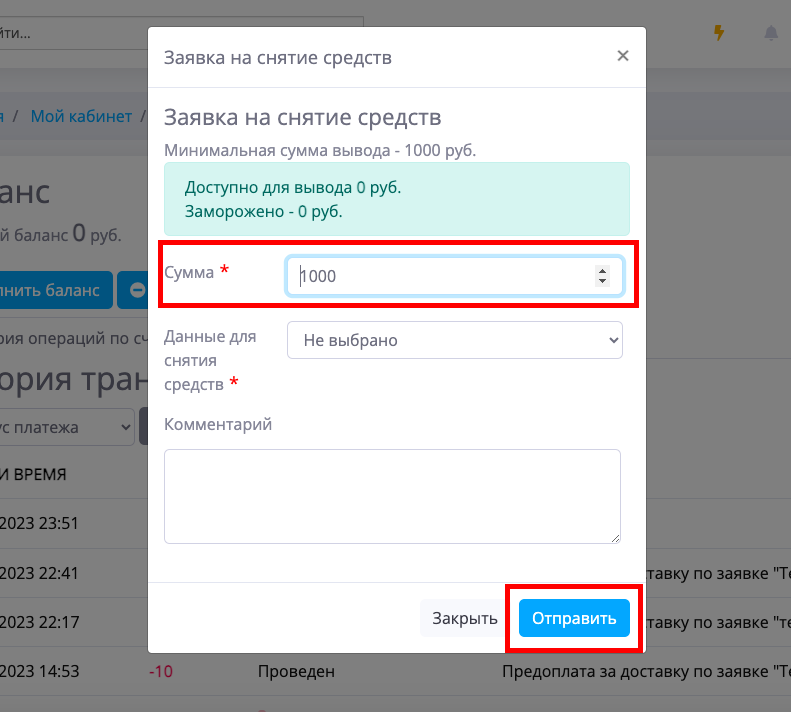 3. Выберите нужный счет и введите сумму, которую хотите вывести. При желании можете оставить комментарий.