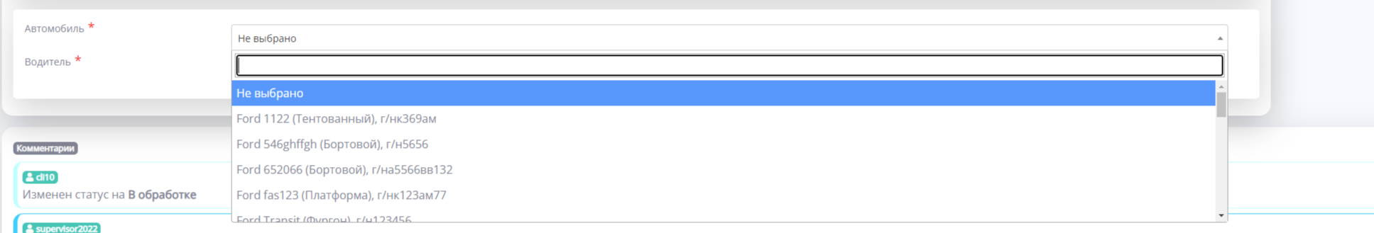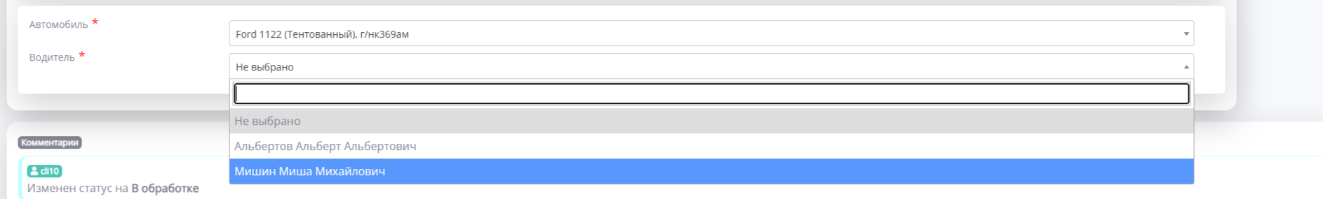 4.После выбора автомобиля откройте таким же образом выпадающий список водителей, которые закреплены к данному автомобилю